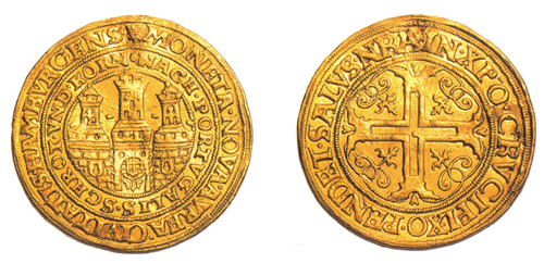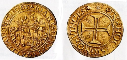 Portugal konnte sich dank der reichen Edelmetallfunde in seinen Kolonien leisten, große und schwere Goldmünzen auszugeben, hier eine undatierte Goldmünze von König João (Johann) II., der von 1521 bis 1557 regierte. Außerhalb von Portugal waren die großen und schweren Goldmünzen beliebt und wurden als „Portugaleser“ nachgeahmt, hier eine undatierte Ausgabe aus Hamburg aus den 1570er Jahren.