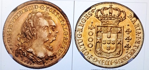 Die Goldmünze zu 4000 Reis von 1777 bildet das Königspaar Maria I. und Pedro III. in trauter Verbundenheit ab, in Wirklichkeit hatte aber nur die machtbewusste Maria in Portugal und seinen Kolonien das Sagen.