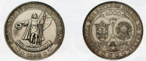 Die Silbermünze von 1900 zu 4000 Reis feiert anlässlich des 400. Jahrestags des Entdeckung des Landes den Seefahrer und Eroberer Pedro Àlvarez Cabral. Er war auf seiner Seereise nach Indien im April 1500 auf Brasilien gestoßen und nahm es für König Manuel I. in Besitz. (Fotos/Repros: Caspar)
