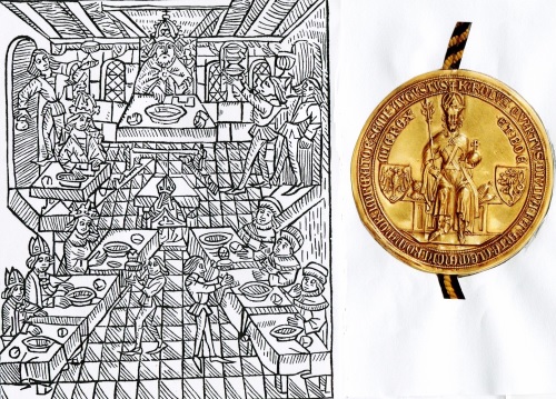 Der Holzschnitt vermittelt eine Vorstellung davon, wie die Kurfürsten den Kaiser einem zeremonialen Essen bedienen. Sie taten das allerdings nicht persönlich, sondern hatten dafür ihre Abgesandten. Das goldene Siegel zeigt den thronenden Kaiser und auf der Rückseite eine fiktiven Ansicht von Rom.