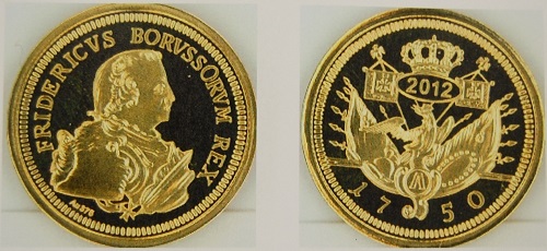 Der preußische Friedrichs d’or von 1750 ist auf der Rückseite durch die Jahreszahl 2012, die sich nicht entfernen lässt, als Nachprägung gezeichnet und wurde mit weiteren Kopien in der Staatlichen Münze Berlin geprägt. Hier die dazu passenden Stahlstempel.