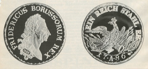 Der mit 1988 gezeichnete Reichstaler Friedrichs des Großen kann niemanden täuschen, denn die Inschrift EIN REICH STAHL ER, mit der Preußens Beteiligung an den Polnischen Teilungen gemeint sein könnte, kommt auf keiner echten Münze dieser Zeit vor.