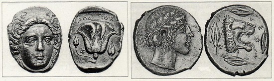 Meisterwerke altgriechischer Stempelschneidekunst sind die Tetradrachmen aus Rhodos mit der Rose und Leontinoi mit lorbeerbekränztem Apollokopf und einem ebenfalls als redendes Wappen gedeuteter Löwen mit aufgerissenem Maul sowie vier darum drapierte Gerstenkörner.