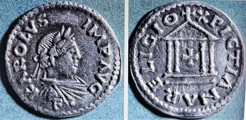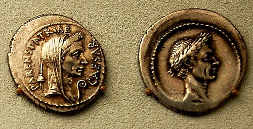 Die römischen Denare zeigen Julius Caesar mit einem Kopftuch und im Schmuck eines Lorbeerkranzes. In der Art der römischen Kaisermünzen hat man um 800 Karl den Großen mit Lorbeerkranz im Haar auf einem seiner sehr seltenen Karlspfennige abgebildet.