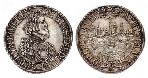 Die Stadt Augsburg ließ es sich nicht nehmen, Kaiser Ferdinand III. auf einem Taler von 1640 mit Lorbeerkranz und Harnisch zu porträtieren.