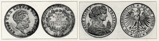 König Anton von Sachsen und weitere Herrscher verzichteten auf Lorbeerkränze und schmückten statt dessen ihre Münzen wie diesen Prämientaler der Forstschule in Tharandt aus dem Jahr 1830 mit Eichenblättern. Wo immer auf Münzen des 19. Jahrhunderts Francofurtia, die Symbolfigur der Metropole am Main, erscheint, trägt sie einen „bürgerlichen“ Eichenkranz im Haar.