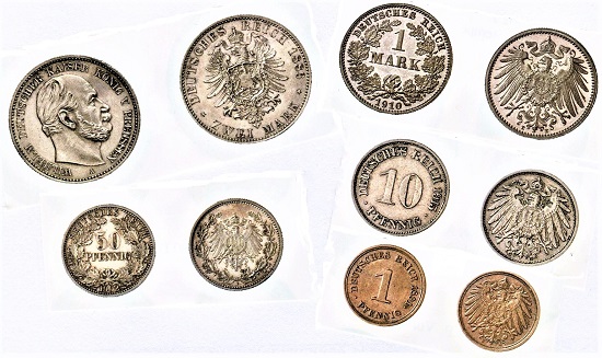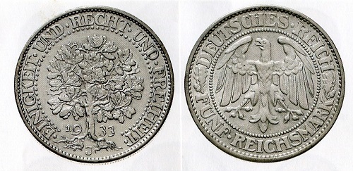Münzen der Kaiserzeit und der Weimarer Republik sind vielfach mit Eichenlaub und im Fall des Fünf-Mark-Stücks mit einem prächtigen Eichenbaum geschmückt. Der auf Vorrat geprägte Jahrgang 1933 ist selten, weil es in jenem Jahr eine Umstellung der unhandlichen Großsilbermünzen auf etwas kleinere Werte gab.