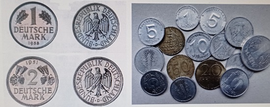 Wenn wir Ausgaben der Bundesrepublik Deutschland und der DDR betrachten, finden wir überall die Eichenblätter, die kaum verrotten, wenn sie im Herbst abgefallen sind. Für Beliebtheit des von Richard M. Werner geschaffenen Modells der jungen Frau, die einen Baumreiser pflanzt, auf dem Fünfzig-Pfennig-Stück spricht, dass dieses Geldstück von 1949 bis 1990 unverändert geprägt wurde. Es ist ein schönes Sinnbild für den Neubeginn der Deutschen nach dem Zweiten Weltkrieg und steht dem gleichen Wert von 1950 aus der DDR gegenüber, der einen von Franz Krischker entworfenen Pflug vor einer Fabrik mit rauchenden Schloten zeigt. Von dieser Münze wurden beachtliche 67 Millionen Stück hergestellt, wobei das Material aus eingeschmolzenen Bronzedenkmälern stammen soll.