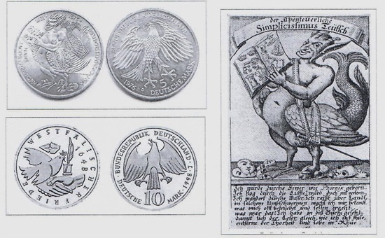 Das von Reinhard Heinsdorff geschaffene Fünf-Mark-Münze von 1976 zum 300. Todestag des wohl bedeutendsten deutschen Dichters der Barockzeit, Hans Jacob Christoph von Grimmelshausen, bedient sich einer bewährten Bildvorlage, nämlich eines aus Mensch, Vogel und Fisch bestehenden Fabelwesens, das den Betrachter grinsend anschaut und ihm ein aufgeschlagenes Buch zeigt. Andere Münzdesigner verwendeten damals die gehörnte Gestalt mit dem teuflischem Pferdefuß, aber auch einen sich über den Erdball erhebenden Pegasus sowie einige auf den Autor und sein Werk weisende Symbole wie Narrenkappe, Schwert, Dreschflegel, Rosenkranz sowie Tintenfass und Schreibfeder.