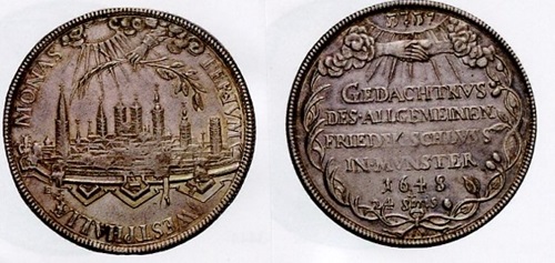 „Der Friede ist das beste aller Dinge“ verkündet eine talerförmige Medaille von 1648 mit der Ansicht der von Bastionen geschützten Stadt Münster auf der einen Seite und drei Tauben als Symbole für das Haus Habsburg, Frankreich und Schweden auf der anderen Seite. Sie halten Ölzweige über eine Krone und ein Zepter. Der münsterische Münzmeister Engelbert Ketteler hatte diese und andere Prägestücke auf eigene Rechnung angefertigt und an die in der Stadt zu den Friedensverhandlungen weilenden Gesandten verkauft. Weitere „Gedächtnusse“ verkünden „Der Friede und die Eintracht zwischen dem Kaiser und den Königen sind das Glück für alle Zeiten“.