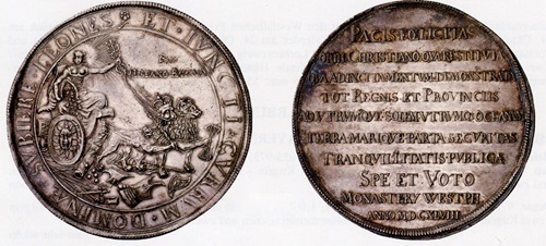 Münzmeister Engelbert Ketteler war in Münster mit seinen Friedensmedaillen von 1648 überaus erfolgreich. Teilnehmer der Verhandlungen nahmen sie sich gern in die Heimat mit. Zu sehen ist die Ansicht der Stadt, die schon bald unter die Herrschaft des dort residierenden Bischofs kam. Den Triumph der guten Sache, also des Friedenswillens über die Kriegsfurie, symbolisiert die Medaille von 1648. Hier zermalmt die Friedensgöttin mit ihrem von Löwen gezogenen Wagen die Symbole des Krieges.