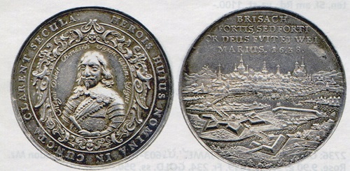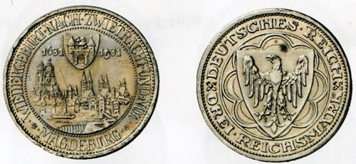 Die Kriegsparteien feierten ihre Siege wie hier die Belagerung und Eroberung der von kaiserlichen Truppen besetzten Reichsfestung von Breisach durch ein in französischem Sold stehendes Heer des Herzogs Bernhard von Sachsen-Weimar. Zum Gedenken an den verheerenden Brand von Magdeburg 1630 gab die Weimarer Republik ein Drei-Mark-Stück heraus und betonte die Wiedergeburt der Stadt aus Zwietracht und Not.