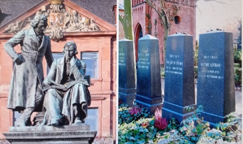 Das von Syrius Eberle geschaffene Denkmal der Brüder Jacob und Wilhelm wurde 1896 vor dem Rathaus ihrer Geburtsstadt Hanau enthüllt. Auf dem Sankt-Matthäus-Friedhof in Berlin-Schöneberg fanden die Brüder und und weitere Familienangehörige ihre letzte Ruhe.