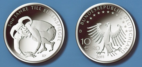 Til Eulenspiegel macht sich auf der Gedenkmünze von 2011 über seine leicht- und wundergläubigen Mitmenschen lustig, und der Lügenbaron von Münchhausen fliegt auf der Ausgabe von 2023 auf der Kanonenkugel durch die Luft. So genannte Farbmünzen wie diese haben sich inzwischen weltweit etabliert und scheinen den Sammlern zu gefallen.