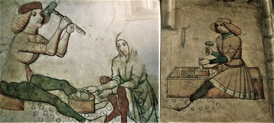 In der Barbarakirche zu Kutná Hora (Kuttenberg) erinnern Wandmalereien an Bergleute und Münzpräger. Die farbenfreudigen Bilder wurden erst im 19. Jahrhundert von dicken Übermalungen befreit. Selbstbewusst präsentieren Bergleute das Kuttenberger Wappen.