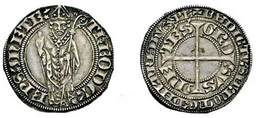 Ein segnender Kirchenfürst schmückt den Groschen, den Dietrich von Boppard als Bischof von Metz im späten 14. Jahrhundert schlagen ließ.