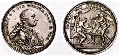 Da Schiller aus Württemberg geflohen war, konnte der rachsüchtige Herzog ihm nichts mehr anhaben, der, das sei am Rande erwähnt, am Hof des preußischen Königs Friedrich II., des Großen, erzogen wurde. Eine der Numismatik gewidmete Medaille von 1777 zeigt, wie der Genius der Münzkunde unter den wachsamen Augen von Chronos, dem antiken Gott der Zeit und Geschichte, ein Geldstück betrachtet und beschreibt. Die Inschrift SUPPLET UBI DEFICIO bedeutet, dass die Münzkunde ergänzt wo die Geschichte versagt. Ab und zu kommen die württembergischen Preismedaillen im Münzhandel vor. Meist handelt es sich um sehr gut gemachte Nachprägungen, die als solche ausgewiesen sind und nicht die enormen Preise der Originale erzielen.
