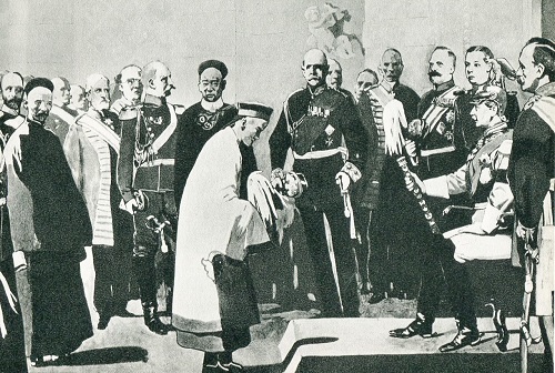 Kaiser Wilhelm II. machte durch sein Säbelrasseln und unvorsichtige Donnerworte immer wieder spektakulär auf sich aufmerksam. In Trinksprüchen und markigen Ansprachen gab er die Richtung seiner auf Konfrontation mit den anderen Großmächten gerichteten Politik an. Berühmt und berüchtigt wurde der Monarch unter anderem durch seine am 27. Juli 1900 in Bremerhaven vor Soldaten gehaltene „Hunnenrede“. Offizieller Anlass für die Entsendung deutscher Soldaten nach China war die heimtückische Ermordung des Gesandten Clemens von Ketteler am 20. Juni 1900 in Peking. An der militärischen Intervention waren Truppen aus dem Deutschen Reich, Frankreich, Großbritannien, Italien, Japan, Österreich-Ungarn, Russland und den USA beteiligt. Deutschland beanspruchte nicht zuletzt im Zusammenhang mit dem Tod seines Gesandten bei der Strafaktion eine Führungsrolle. Wilhelm II., der eine gute Gelegenheit sah, der Welt die Größe und Militärkraft seines an die „Sonne“ strebenden Reiches zu demonstrieren, gelang es, dass dem ehemaligen deutschen Generalstabschef Alfred von Waldersee der Oberbefehl über das gemeinsame Expeditionsheer übertragen wurde. Die militärischen Auseinandersetzungen endeten mit der Eroberung von Peking und der Niederlage der Chinesen.