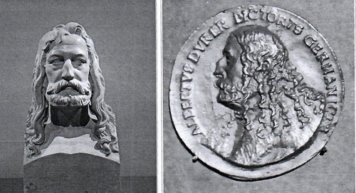 Gipsabguss einer 1838 von Christian Daniel Rauch für die Walhalla bei Regenstauf geschaffenen Marmorbüste, rechts eine Medaille aus Bronzeguss, für die Dürer um 1520 Hans Schwarz zwei Goldgulden zahlte. baren Werken des Nürnberger Meisters ganz nah - links die Apokalyptischen Reiter