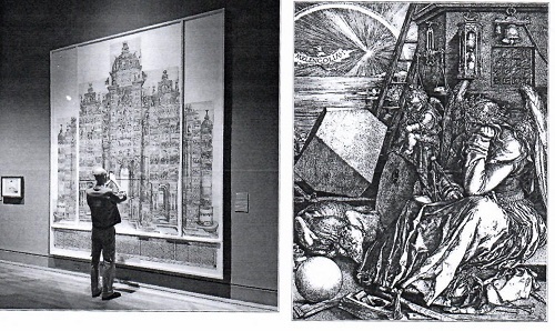 Dass der auch „letzter Ritter“ genannte Kaiser Maximilian I. wie andere Mitglieder des Hauses Habsburg und weitere Fürstlichkeiten beim Augsburger Handels- und Bankhaus Fugger aufgrund ihrer vielen Kriege und prunkvollen Hofhaltung bis über die Ohren verschuldet waren, sollte beim Anblick dieser fantasievoll ausgeformten, von zahlreichen Holzschneidern der Dürerzeit geschaffenen Elogen nicht unbeachtet bleiben. Die aus zahlreichen Einzeldrucken zusammengefügte Ehrenpforte Kaiser Maximilians I. ist ein interessantes Zeugnis für den Herrscherkult um 1500 und ein besonderer Hingucker in der Albrecht Dürer gewidmeten Spurensuche, die das Kupferstichkabinett der Staatlichen Museen zu Berlin in der Gemäldegalerie am Kulturforum eingerichtet hat. Der 1514 Kupferstich „Melencolia I“ von 1514 steckt voller Rätsel, die bis heute nicht gelöst sind. (Fotos/Repros: Caspar)