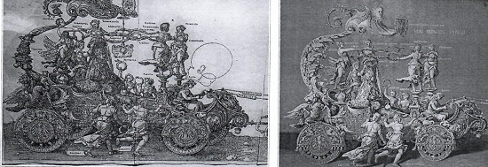 Eines der eindrucksvollsten Exponate ist der aus acht Druckstöcken gebildete Triumphwagen für den 1519 verstorbenen römisch-deutschen Kaiser Maximilian I. aus dem Jahre 1522. Geplant war ein 54 Meter langes Druckwerk, das aus 210 Holzschnitte von etwa 41 mal 37 Zentimetern Größe. Nach dem Tod Maximilians 1519 wurde das Werk nicht weiter geführt. Albrecht Dürer entwarf die Bilderfolge als Ergänzung zur riesigen Ehrenpforte, die wenige Schritte vom Eingang zur Ausstellung gezeigt wird. Beide Werke erinnern an wirkliche und vermeintliche Taten und Tugenden des Kaisers und gemahnen seine Nachfolger, es ihm gleich zu tun. Bildprogramm und Legenden stammen von Dürers Freund, dem Humanisten und Patrizier Willibald Pirckheimer. Die Ehrenpforte ist das größte Exponat der Ausstellung. Mit 192 Druckstöcken hergestellt, feiert das um 1512 in Auftrag gegebene monumentale Holzschnittwerk Maximilian I. und zeigt seine Vorfahren und fürstlichen Zeitgenossen. Die erste Edition kam 1517 heraus, eine zweite 1526. Das Monumentalwerk ist mit 295 mal 357 Zentimetern einer der größten Drucke, die je produziert wurden. Die Ehrenpforte sollte an Wänden in Rathäusern und fürstlichen Palästen montiert und den Ruhm des deutschen Reichsoberhaupt verkünden.