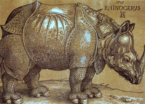 Exotische Tiere wie das Rhinocerus war Albrecht Dürer einen Holzschnitt wert. Das aus Indien stammende Panzernashorn war 1515 nach Lissabon gelangt. Obwohl die Grafik der Realität ziemlich nahe kommt, wird vermutet, dass der Künstler die tierische Sensation selbst nicht zu Gesicht bekommen hat.