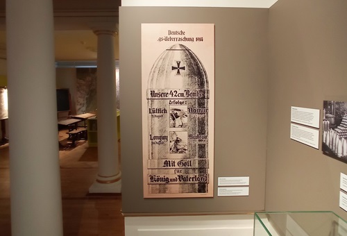 Der Erste Weltkrieg ist unter anderem mit einem Plakat präsent, das die Wirkung starker Geschosse verherrlicht.