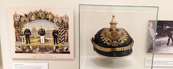 Dass überall in der damaligen Reichshauptstadt Soldaten marschierten und sie wie eine große Kaserne angesehen wurde, wird in der Ausstellung durch einen Helm dokumentiert, den man wegen seiner Spitze auch Pickelhaube nannte.