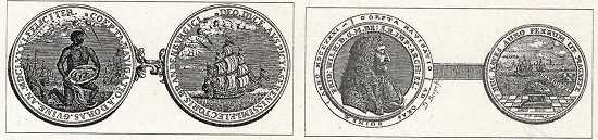 Die angeblich unter göttlichen Auspizien erfolgte Gründung und Ausbeutung der Kolonie Großfriedrichsburg war Kurfürst Friedrich Wilhelm die Prägung dieser Medaillen wert. Mit ihnen konnte er sich als Kolonialherr präsentieren.