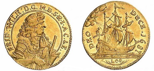Aus afrikanischem Gold bestehen die Guineadukaten mit dem Bildnis des Großen Kurfürsten und einem Segelschiff.