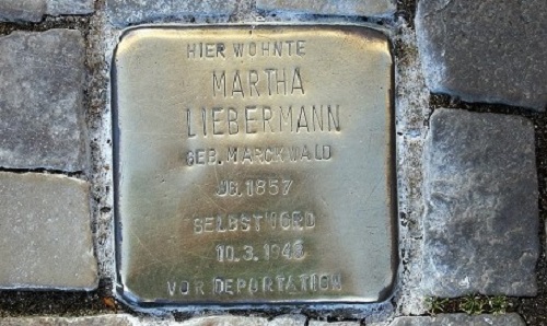 Vor dem Haus erinnert ein Stolperstein an die von den Nazis drangsalierte und um ihren Besitz, nicht aber ihre Würde gebrachte Martha Liebermann, die sich vor 80 Jahren durch Freitod ihrer Deportation nach Theresienstadt entzog.