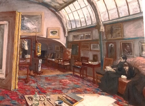 Das mit Glas überdachte Künstleratelier ärgerte Wilhelm II. so sehr, dass er gerichtlich dagegen vorging, allerdings erfolglos. Martha Liebermann ist auf dem Bild vorn rechts zu sehen, sich selbst hat der Meister in einen Spiegel gemalt. Dem Kaiser, der die Häuser neben dem Brandenburger Tor am liebsten hätte abreißen lassen, um es für sich wirken zu lassen, soll der Maler zu verstehen gegeben haben, er werde sein Haus nur mit den Füßen nach vorn, also tot, verlassen.