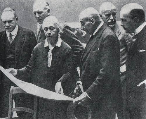 Auf der Fotografie von 1909 ist der Maler rechts sitzend mit Zylinder im Kreis seiner Kollegen zu sehen. Käthe Kollwitz, hier im Gespräch mit dem Akademiepräsidenten, war eine der wenigen, die ihn 1935 zur letzten Ruhe geleitete.