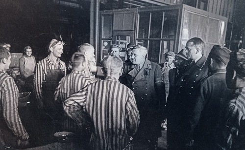 Hitlers Lieblingsarchitekt und Rüstungsminister Albert Speer entging 1946 dem Galgen und gab sich nach zwanzigjähriger Zuchthaushaft in Spandau als „guter Nazi“ aus und startete im Alter, unterstützt von zwielichtigen Verlegern und Journalisten, eine Karriere als Buchautor und Medienstar. Das Foto zeigt ihn im Gespräch mit KZ-Häftlingen, denen es scheinbar gut geht und die sogar zu Scherzen aufgelegt scheinen. (Fotos, Repro: Caspar)