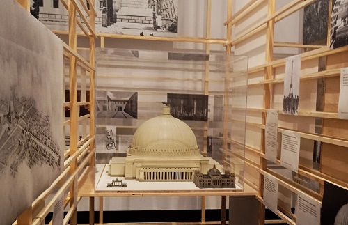 Das Modell der für Berlin vorgesehenen Großen Halle lässt erkennen, wie klein unbedeutend das Brandenburger Tor und das Reichstagsgebäude ausgesehen hätten, wären diese und weitere Monumente hitlerschen Größenwahns verwirklicht worden. Hinterher wurde deutlich, dass der sumpfige Boden den gewaltigen Lasten wahrscheinlich nachgegeben hätte.
