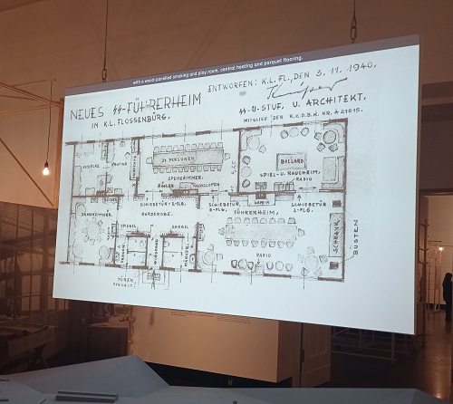 Auf einer großen Videowand wird das KZ Flossenbürg näher erläutert. Die im Steinbruch arbeitenden Häftlinge waren nicht nur unterernährt und krank, sondern wurden von den Wachmannschaften auch schikaniert etwa indem im Winter die Stufen zu ihrer Arbeitsstätte mit Wasser begossen wurden um sie glitschig zu machen. Die Wachmannschaften ließen es sich derweil gut gehen. Der Hausgrundriss zeigt für sie vorgesehene Speise-, Billard- und andere Zimmer.