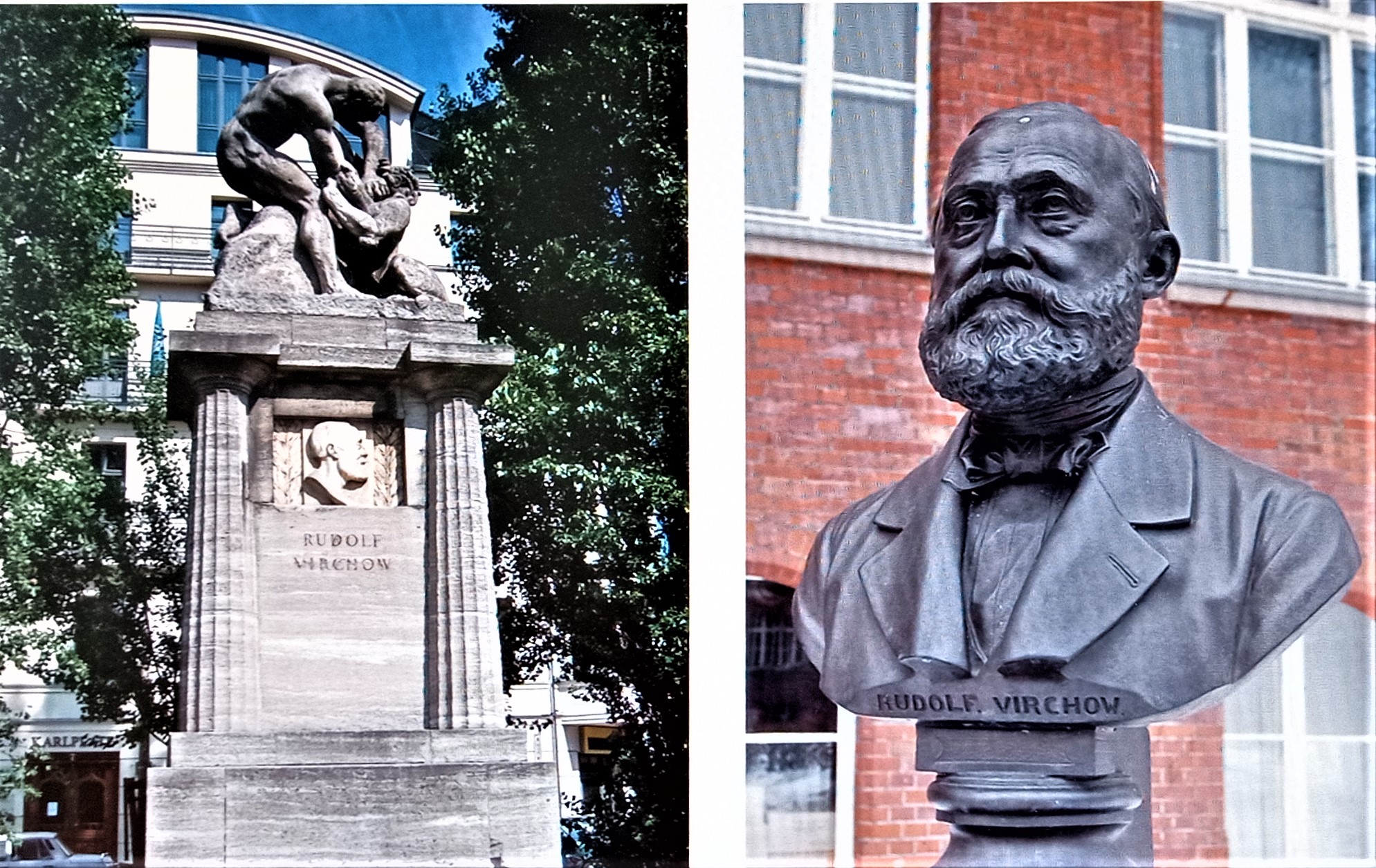 Das Denkmal in der Nähe der Berliner Berliner Charité und die Bronzebüste auf ihrem Gelände ehren den berühmten Arzt, Prähistoriker und Politiker Rudolf Virchow.
