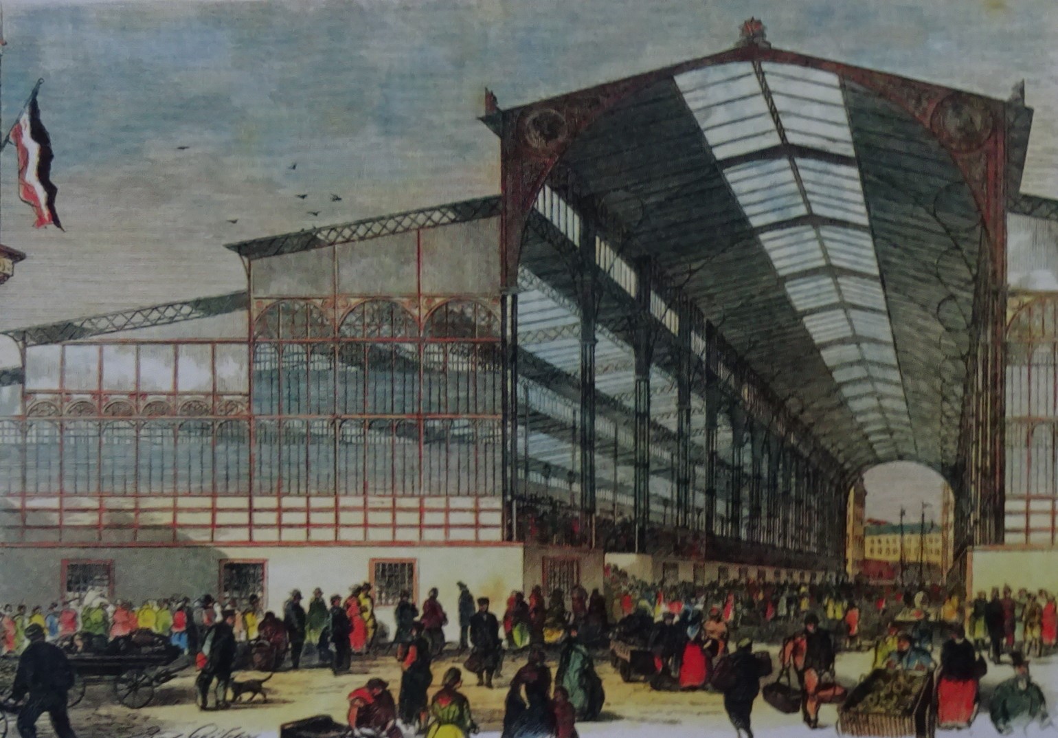 Marktfrauen und Hökerinnen, die die Standmieten nicht aufbringen konnten oder wollten, wehrten sich vergeblich gegen die Markthallen und mussten ihre Ware weiter auf der Straße anbieten. Hier ein Blick in die Markthalle an der Karlstraße, heute Reinhardtstraße.