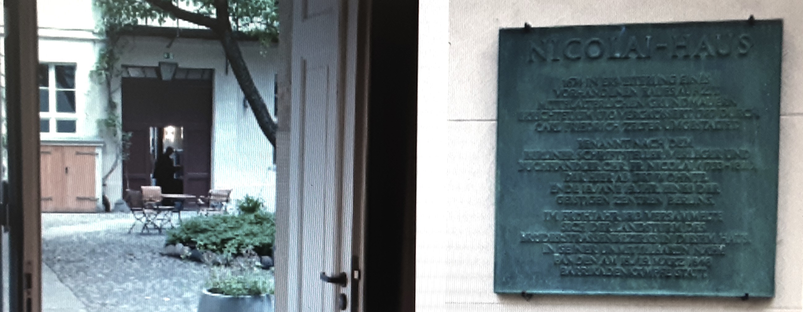 Der Schriftsteller, Aufklärer, Verleger, Geschäftsmann, Gastgeber für das geistige Berlin vor und nach 1800 und Vater von acht Kindern, die alle vor ihm starben, ist in dem Gebäude allgegenwärtig. Beim Tag des offenen Denkmals am 14. September 2025 sprachen Dieter Beuermann, der Chef des wieder in die Brüderstraße 13 zurück gekehrten Nicolai Verlags, und Ingrid Scheurmann (Denkmalstiftung) sprachen über Nicolai und seine Zeit sowie über die wechselvolle Geschichte des Hauses, seine Bewohner, Gäste und das „Berliner Dreigestirn“ Friedrich Nicolai, Gotthold Ephraim Lessing und Moses Mendelssohn, das weit über Berlin, Preußen und Deutschland hinaus strahlte. Zu Zeiten von Nicolai traf sich in der Beletage das gelehrte und literarische Berlin zu geselligen Runden. Unter den Gästen waren befanden sich der Grafiker Chodowiecki, der Bücher des Nicolai Verlags illustrierte, und der Bildhauer Schadow, der unter eine eindrucksvolle Büste des Gastgebers schuf, ferner der Architekt Schinkel, die Brüder Humboldt, der Dichter der Befreiungskriege Theodor Körner und viele andere. An Bewohner und Gäste erinnern sechs Schrifttafeln an der Hausfassade.