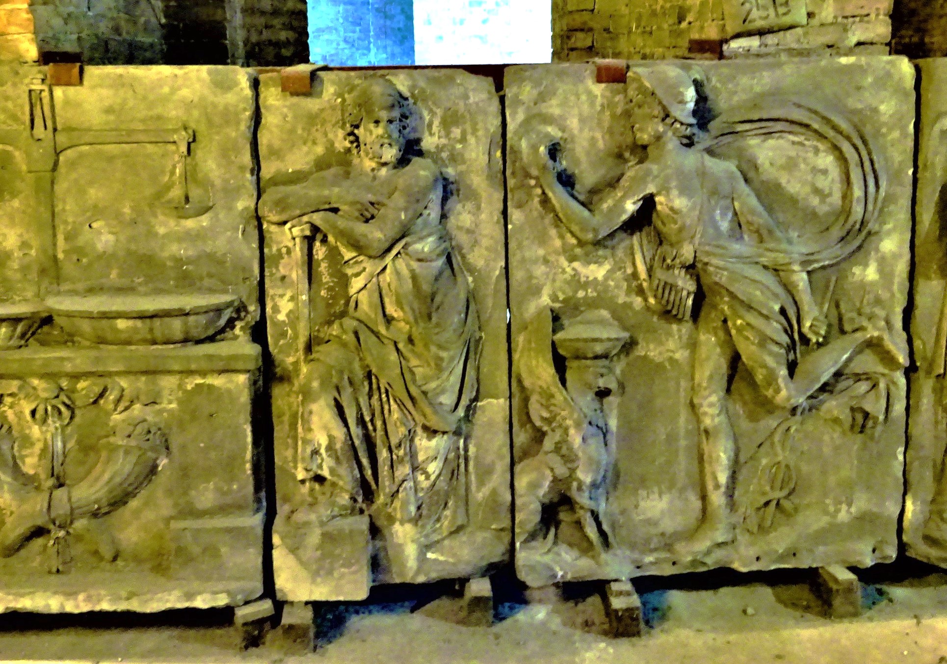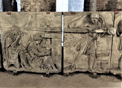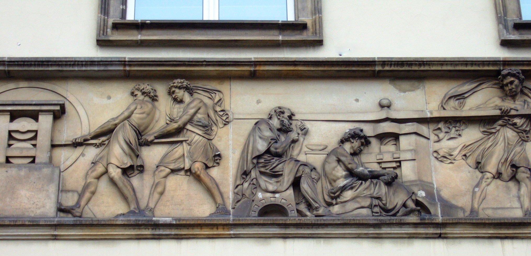 Die in den Katakomben des Kreuzbergdenkmals deponierten Reliefs symbolisieren die Aufgaben des Hauses, in dem anfangs auch die Bauakademie und die Mineralogische Sammlung untergebracht waren.