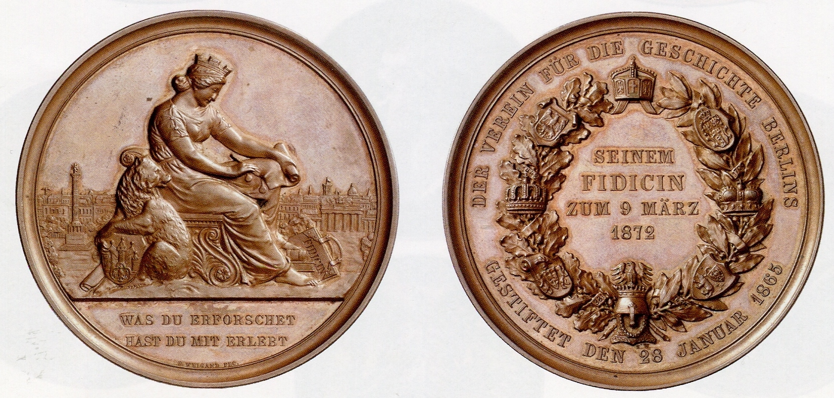 Der Verein für die Geschichte Berlins e.V. ehrt Persönlichkeiten, die sich um die Erforschung der Berliner Vergangenheit besonders verdient gemacht haben, mit der Fidicin-Medaille. Auf ihr liest Berolina, die Symbolfigur der Stadt, im Buch der Geschichte.
