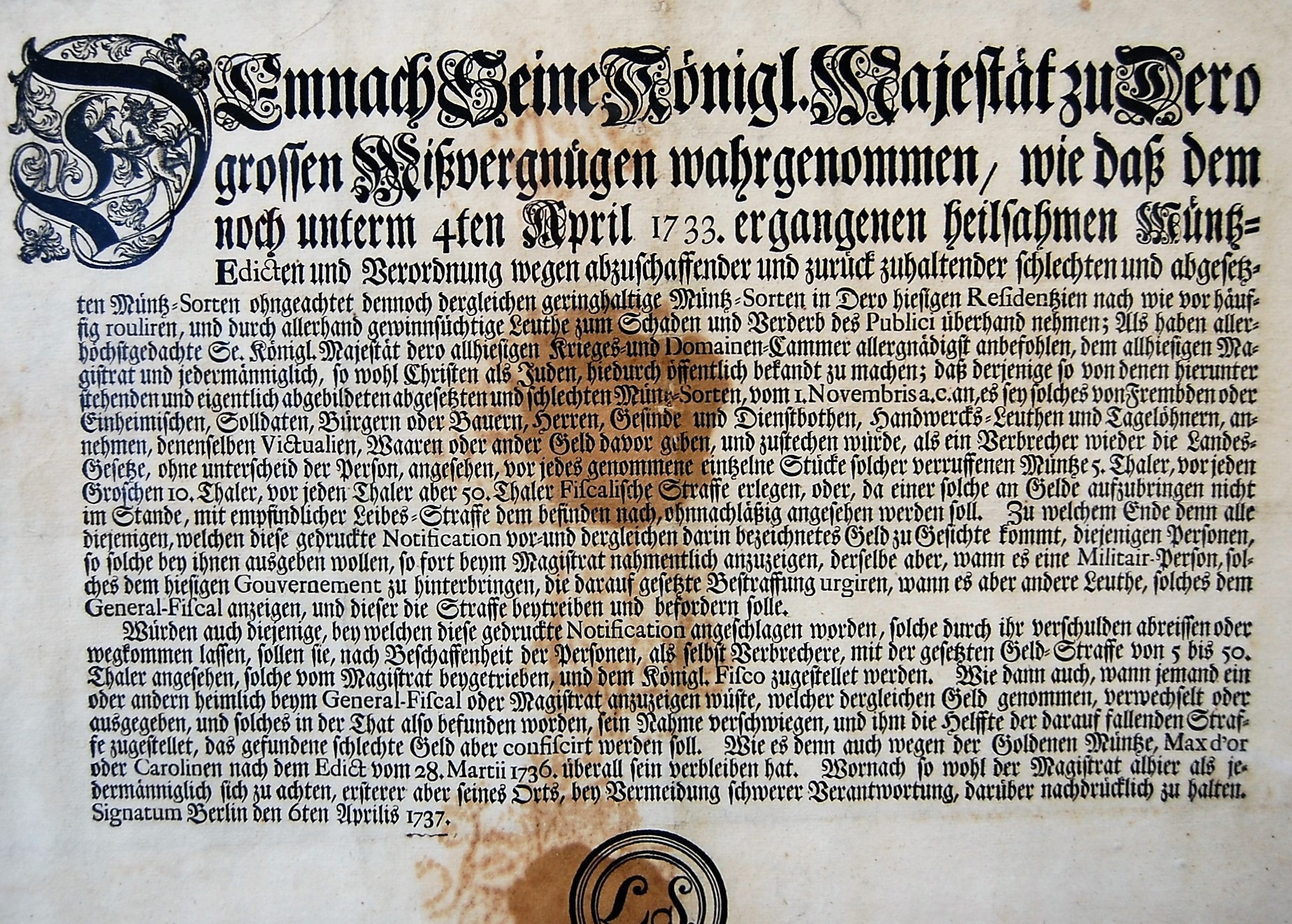 Münzedikte wie dieser Druck aus dem Jahr 1737 im Besitz der Stiftung Stadtmuseum Berlin und als Depot im Landesarchiv am Eichborndamm im Bezirk Reinickendorf untergebracht sind einzigartige Geschichts- und Sprachquellen. Sie zu lesen und zu verstehen, bedarf einiger Übung und braucht viel Zeit.