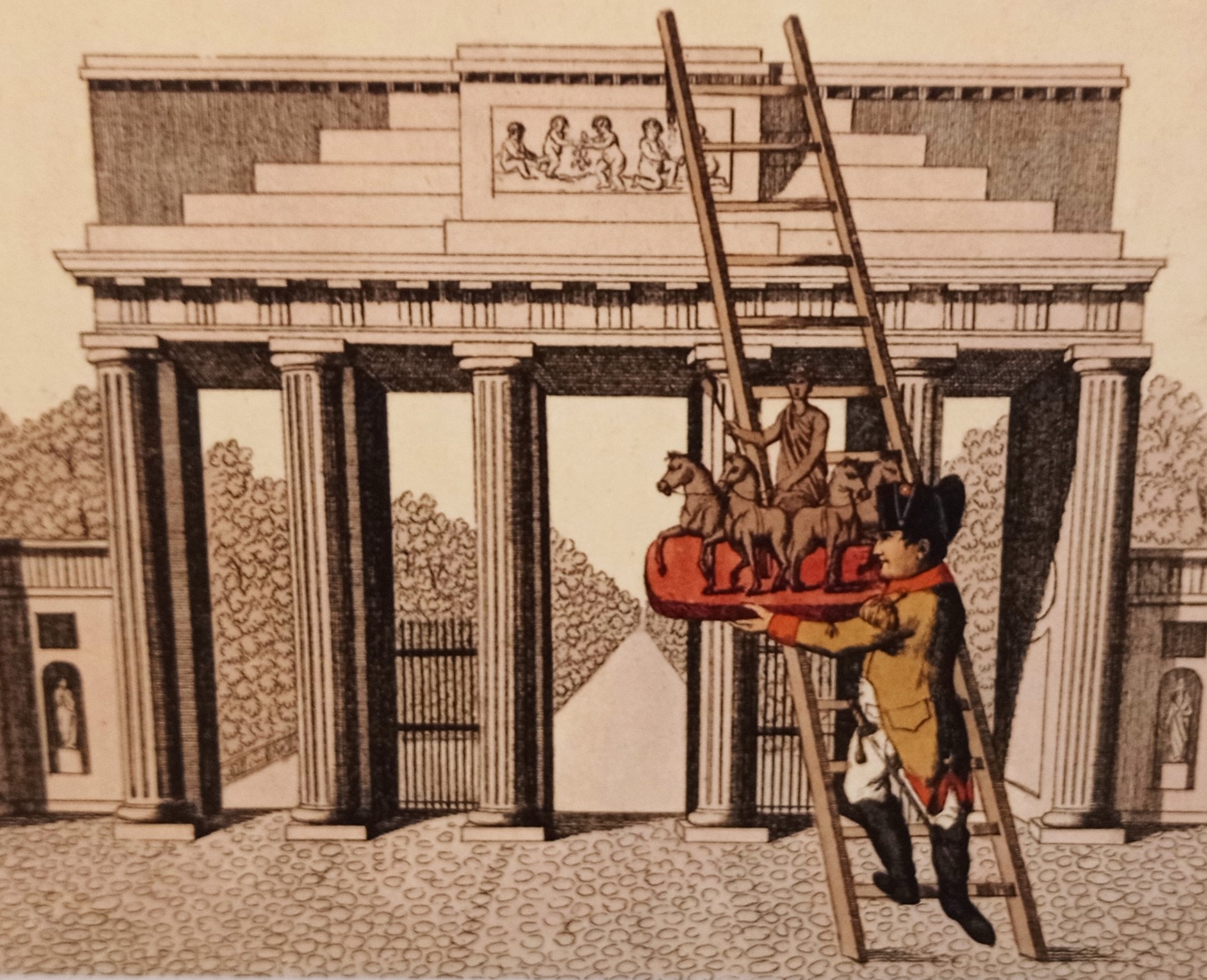 Während sich die Raubzüge in den königlichen Schlössern hinter den Kulissen abspielten, erregte der Abbau der Quadriga vom Brandenburger Tor die Berliner ungemein. Johann Gottfried Schadow konnte nicht verhindern, dass die Friedensgöttin und ihre Pferde in Stücke zerlegt und per Schiff nach Paris geschafft wurde. Vergebens hatte der Bildhauer darauf verwiesen, dass das dünne Kupferblech leiden würde. Angebote der Besatzer, für sie zu arbeiten, lehnte der Bildhauer und Akademiedirektor höflich, aber bestimmt ab. Wegen der großen Not in Preußen als Bildhauer zur Untätigkeit verurteilt, nahm er in bissigen Karikaturen den Kaiser und seine Gefolgsleute aufs Korn, signierte seine Bilder vorsichtshalber mit „Gilrai“.