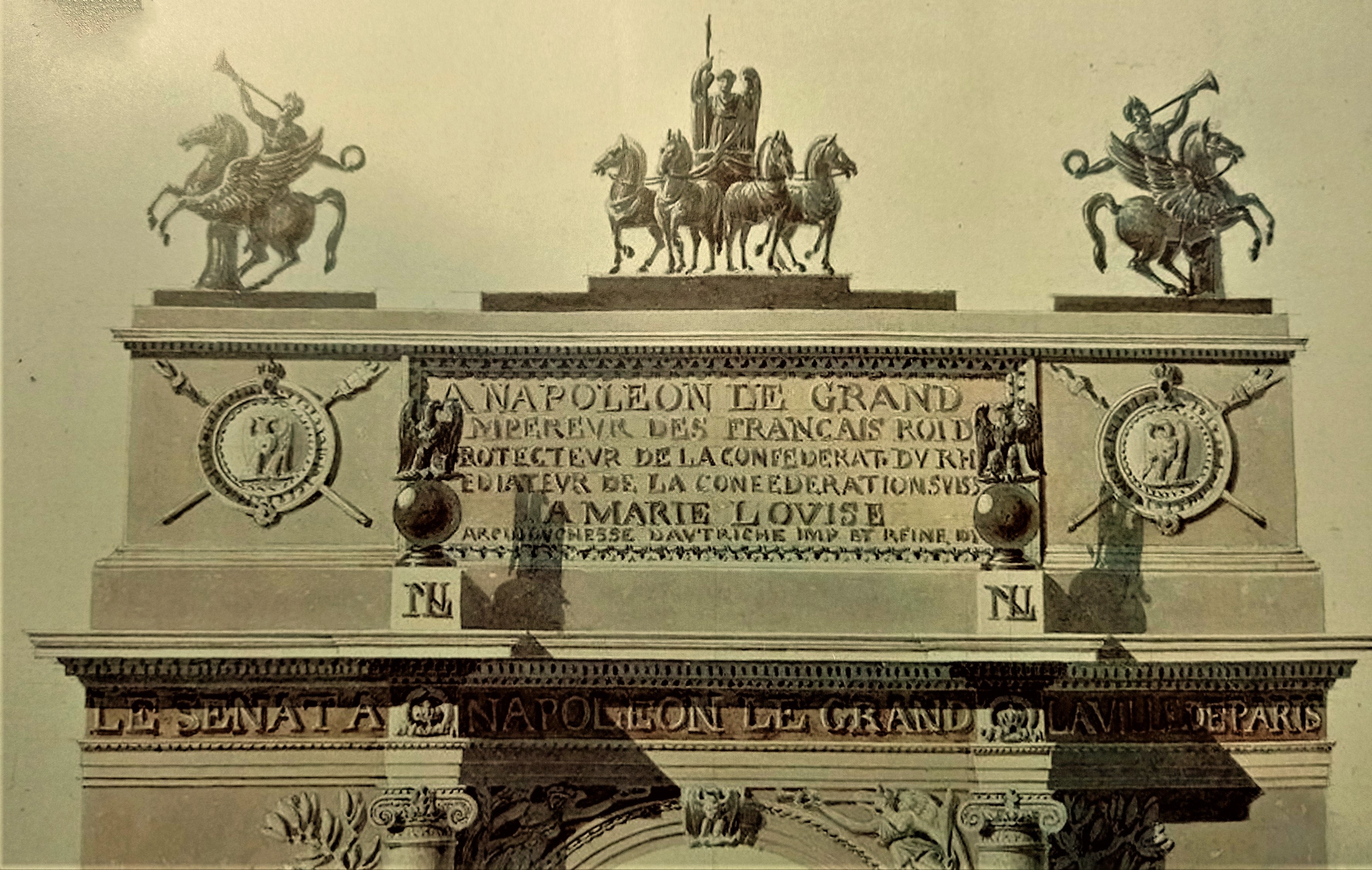 Schadows Quadriga auf einem „Napoleon dem Großen“ und seiner Frau Marie Louise gewidmeten Triumphtor zu stellen, blieb in der Planung stecken.