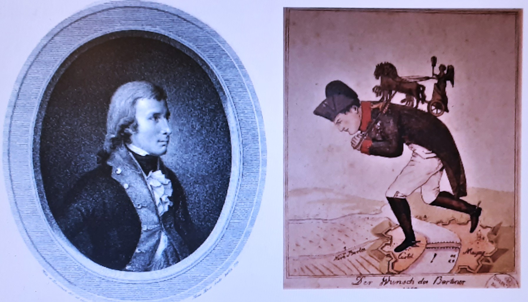 König Friedrich Wilhelm III. und seine Untertanen mussten nach 1806 die schmachvolle Behandlung durch die siegreichen Franzosen geduldig ertragen. Sie harrten in der Hoffnung auf Revanche aus, die in den Befreiungskriegen von 1813 bis 1815 erfolgte. Die Karikatur nimmt den vom Thron gejagten Napoleon I. als Kunsträuber satirisch aufs Korn.