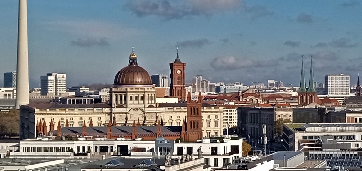 Vor und beim Wiederaufbau des Berliner Schlosses gab es viel Bedenken, ob sich dieser neue Kulturstandort gegenüber den Staatlichen Museen behaupten wird. Aber wie sich zeigt, kann man im Humboldt Forum über mangelndes Interesse nicht klagen. Beide Einrichtungen machen sich keine Konkurrenz. Hier ein Blick vom Fernsehturm auf den Nachbau mit der imposanten Schlosskuppel.