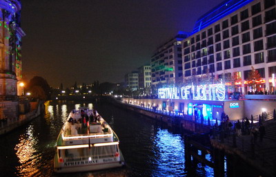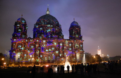 Zahlreiche Berliner Gebäude wurden im Oktober 2009 beim "Festival of Lights" festlich und in immer anderen Farben beleuchtet. Unzählige Schaulustige bevölkerten Straßen und Plätze wie hier den Prachtboulevard Unter den Linden mit der Humboldt-Universität und der Staatsoper sowie den Gendarmenmarkt mit dem Schauspielhaus in der Mitte.