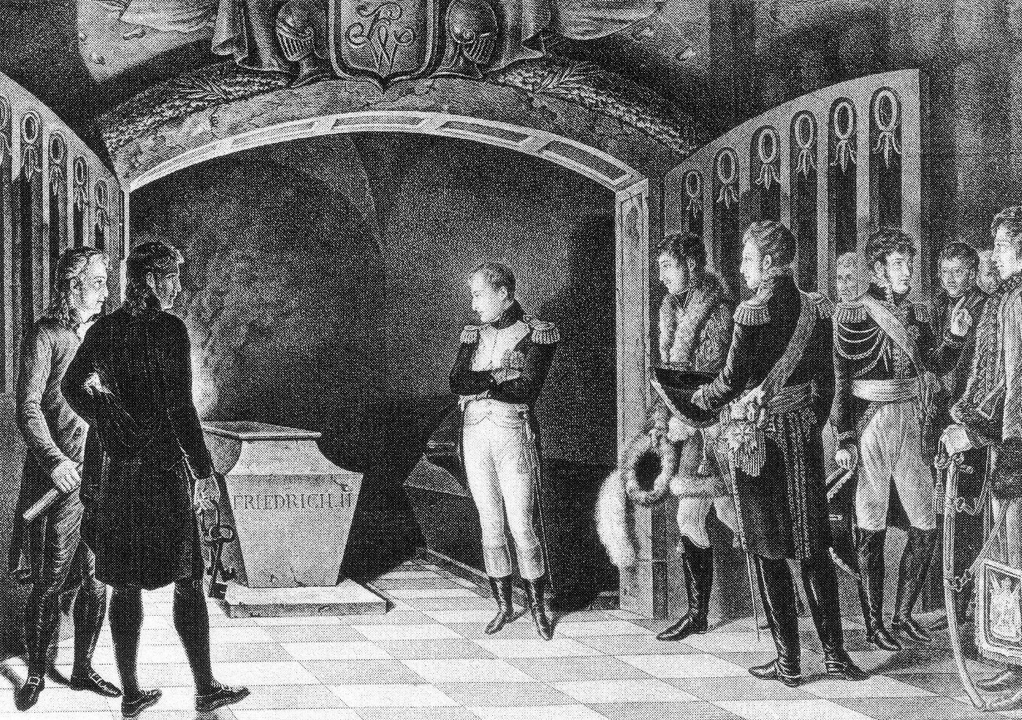 Preußens König Friedrich Wilhelm III., seine Gemahlin Luise und Zar Alexander I. beschworen 1805 am Grab Friedrichs des Großen in der Potsdamer Garnisonkirche einander ewige Freundschaft. Ein Jahr später hatte sich das Blatt gewendet. Da überlegte Kaiser Napoleon I. am gleichen Ort, was wäre, wenn der hier bestattete Preußenkönig noch leben würde und Preußen bei Jena und Auerstedt nicht verloren hätte.