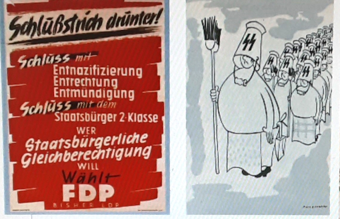 Die in den Parlamenten vertretenen Freien Demokraten forderten das Ende der Entnazifizierung und einen Schlussstrich unter der Vergangenheit. Die Karikatur zeigt, wie sich SS-Leute als Putzfrauen tarnen. Das DDR-Plakat ruft zum Kampf für den Frieden auf und bedient sich eines Gerippes in SS-Uniform, die Zerstörung über das Land zu bringen droht, wenn die Europäische Verteidigungsgemeinschaft gegründet wird.
