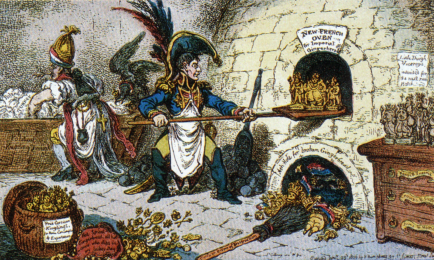 Die englische Karikatur verspottet Napoleon I. als Bäcker neuer Fürstentümer. Der erboste Kaiser, der sich als Herrscher der Welt porträtieren ließ, hätte die frechen Zeichner am liebsten aufgehängt, wenn er ihrer habhaft geworden wäre.